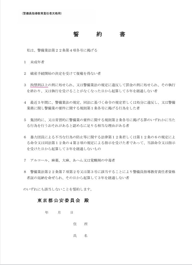 警備業者や警備員が提出する誓約書などの様式についても、欠格事由に該当しないことを誓約する文言が、「禁錮以上の刑」から「拘禁刑以上の刑」へと修正されています。