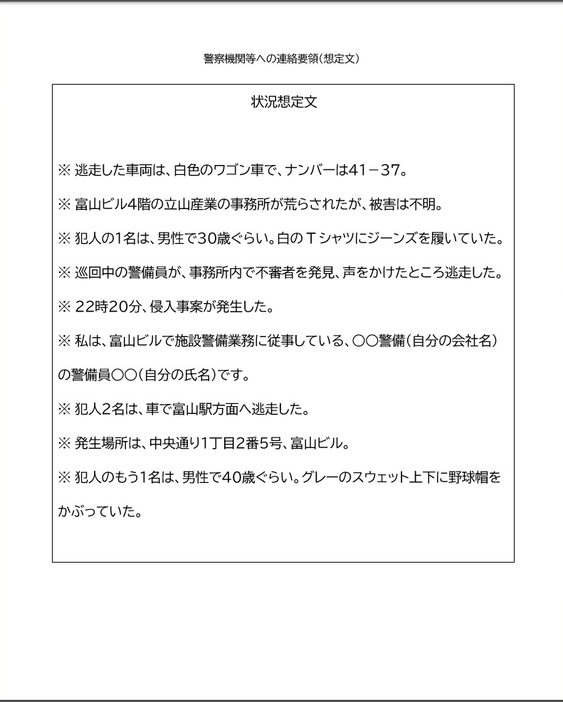 そして本番では、1分間で「状況想定文」 を見ながら(メモしながら)、頭の中にある定型文の○○部分に、発生時刻や場所、犯人の服装などを当てはめていく。